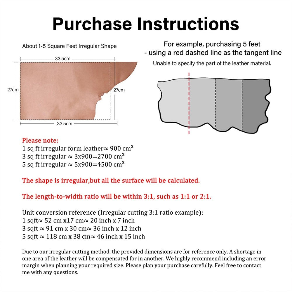 Due to our irregular cutting method, the provided dimensions are for reference only. A shortage in one area of the leather will be compensated for in another. We highly recommend including an error margin when planning your required size. Please plan your purchase carefully. Feel free to contact me with any questions.
