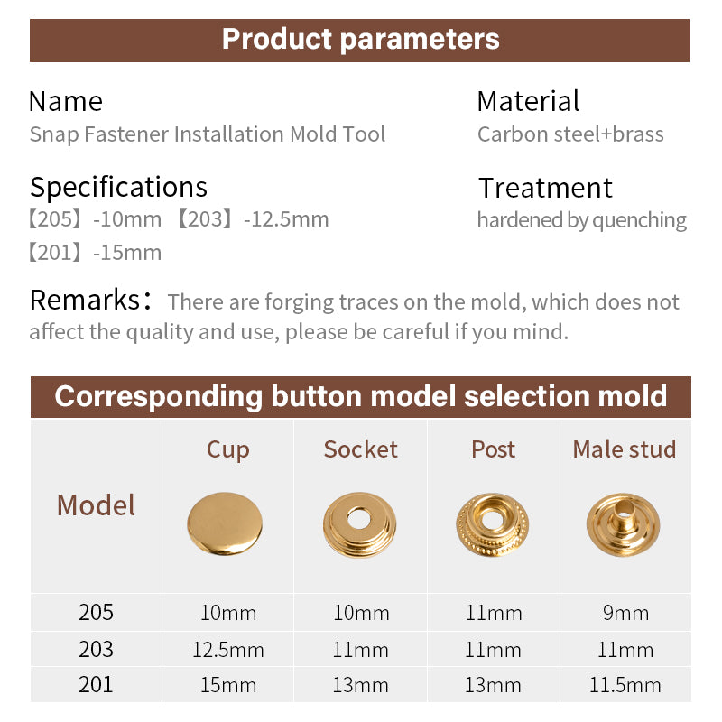 Customized molds with WUTA Brand snap fasteners data, also suitable for most standard snap fasteners on the market. (European standards and some brands with mismatched sizes are not applicable).