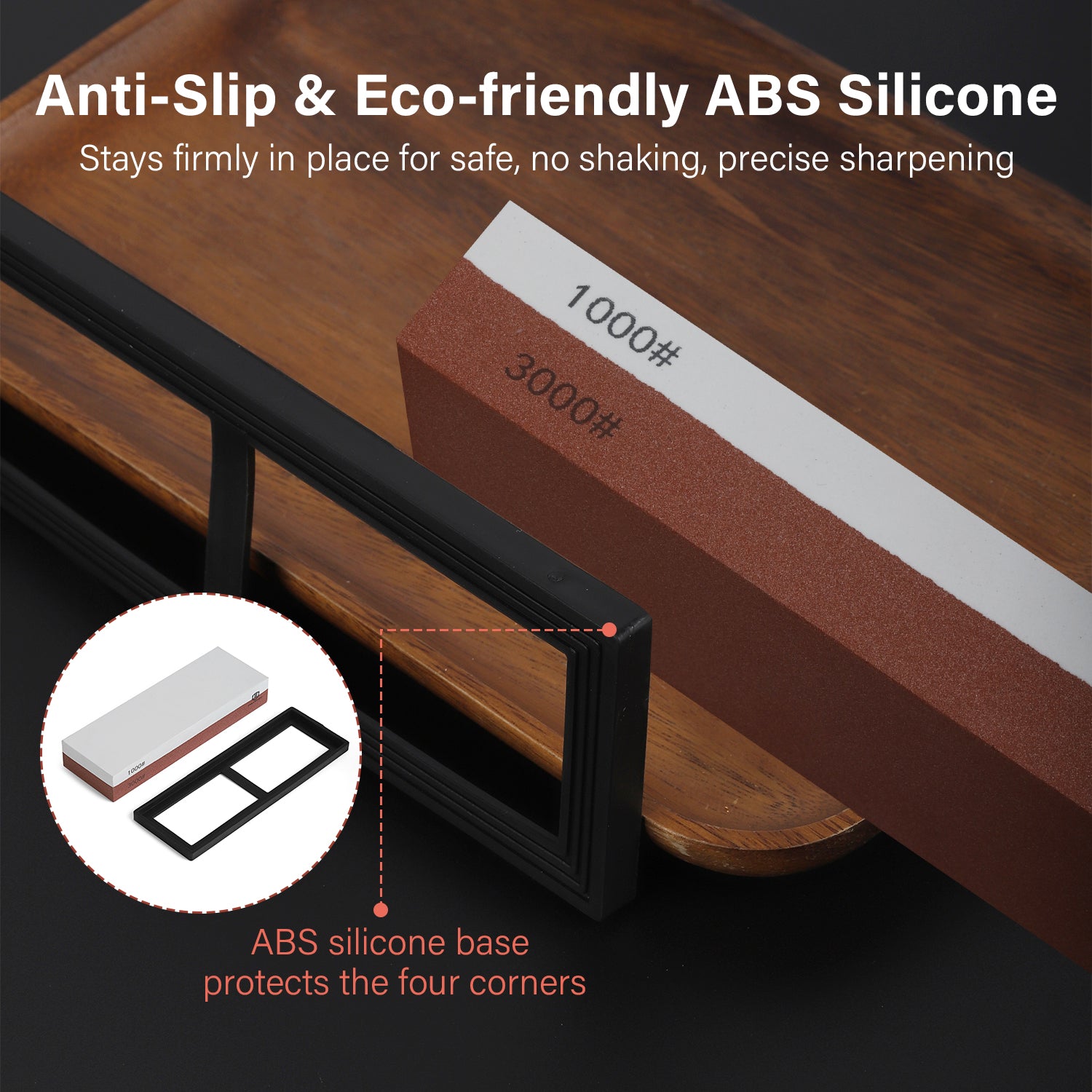 3. Sécurité : Nous comprenons l’importance de la sécurité lors de l’utilisation de l’outil d’affûtage. La base en silicone que vous achetez peut fixer la pierre sur la surface en cuir. Ce réglage garantit que la pierre est fixée en un seul endroit lors de l’affûtage.