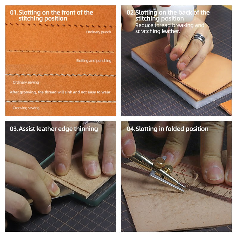 Make a 1.5mm width groove on the leather back of the sewing position, the specific depth depends on the leather thickness, then use a bone folder to press the groove; finally, punch h hole in the groove line, which will reduce thread breaking and scratching the leather.
