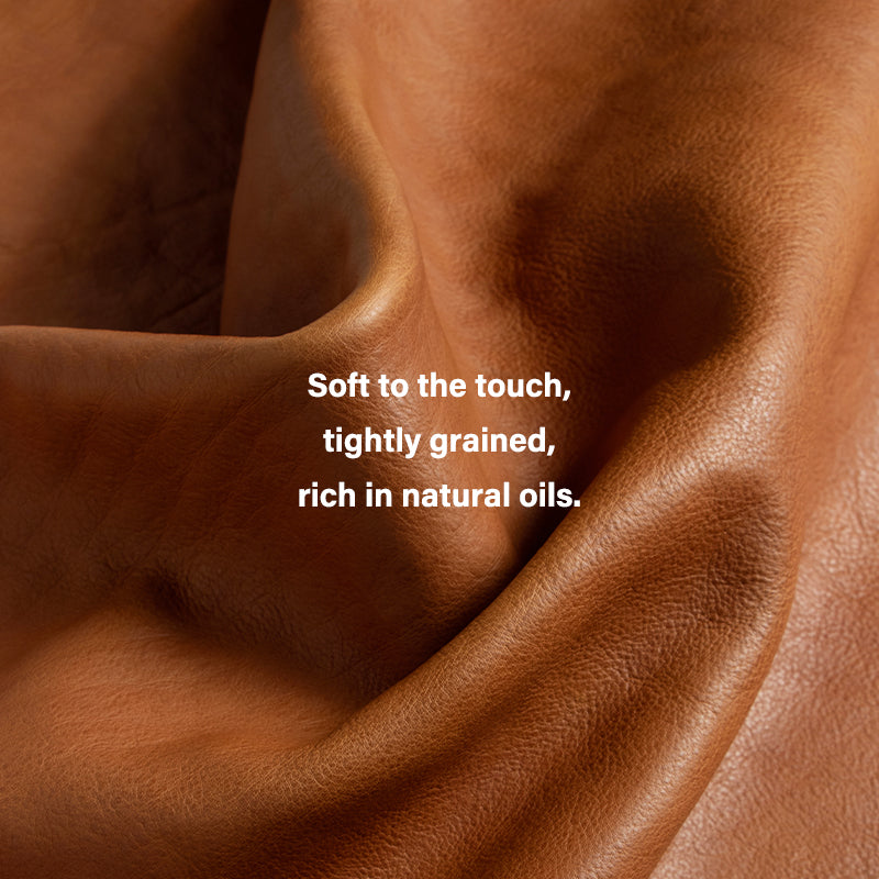 Process: veg tanning with natural texture. This leather has been on the scene since the 1980s and is very much a classic material.