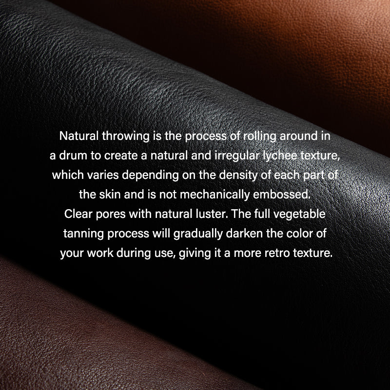 Natural throwing is the process of rolling around in a drum to create a natural and irregular lychee texture, which varies depending on the density of each part of the skin and is not mechanically embossed. Clear pores with a natural luster. The full vegetable tanning process will gradually darken the color of your work during use, giving it a more retro texture.