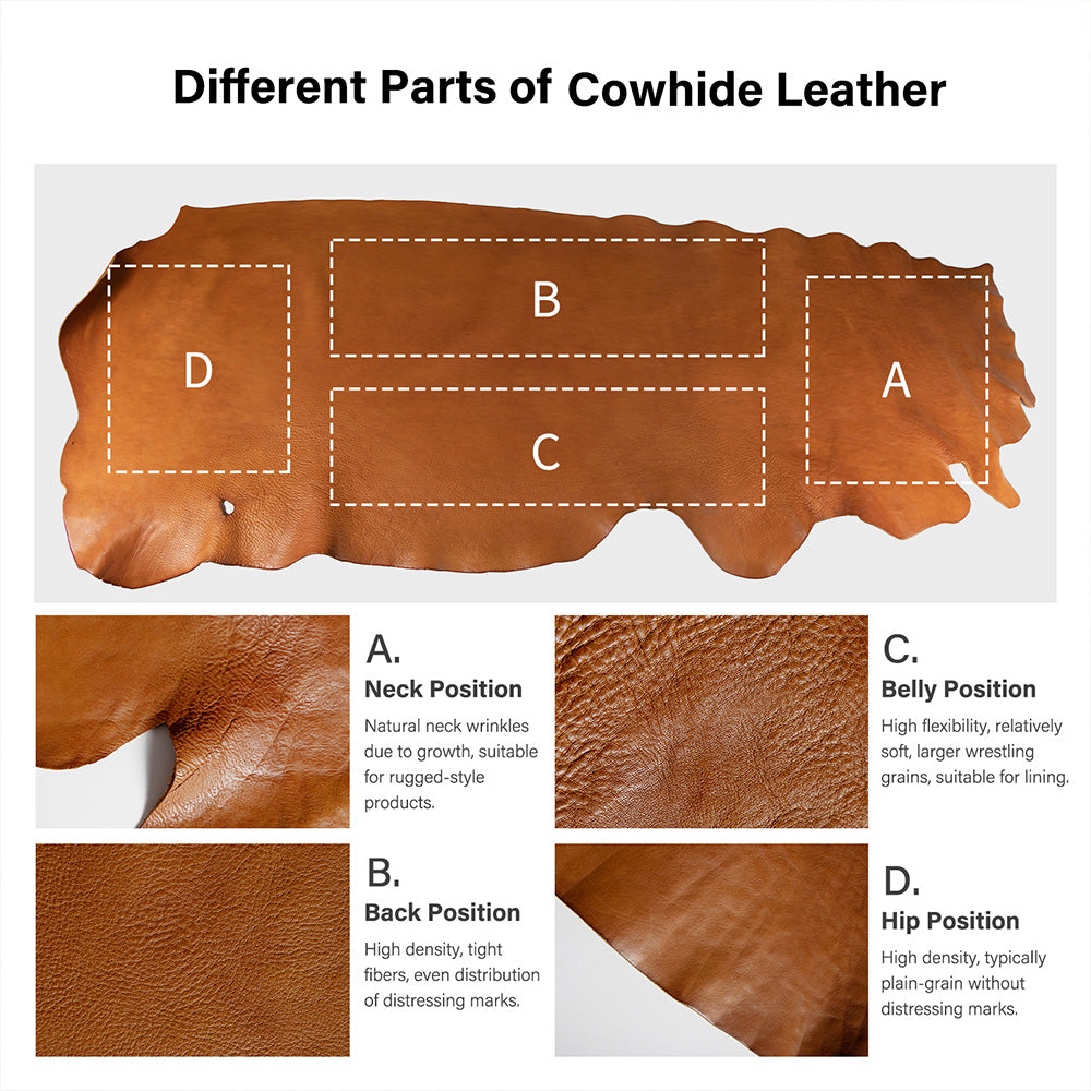 💎【Purchase Instructions】Different Parts of cowhide leather have different patterns on the leather surface. Neck: Rugged style. Back: Uniform distress marks.Belly: Soft for the lining. Hip: Plain, no marks.