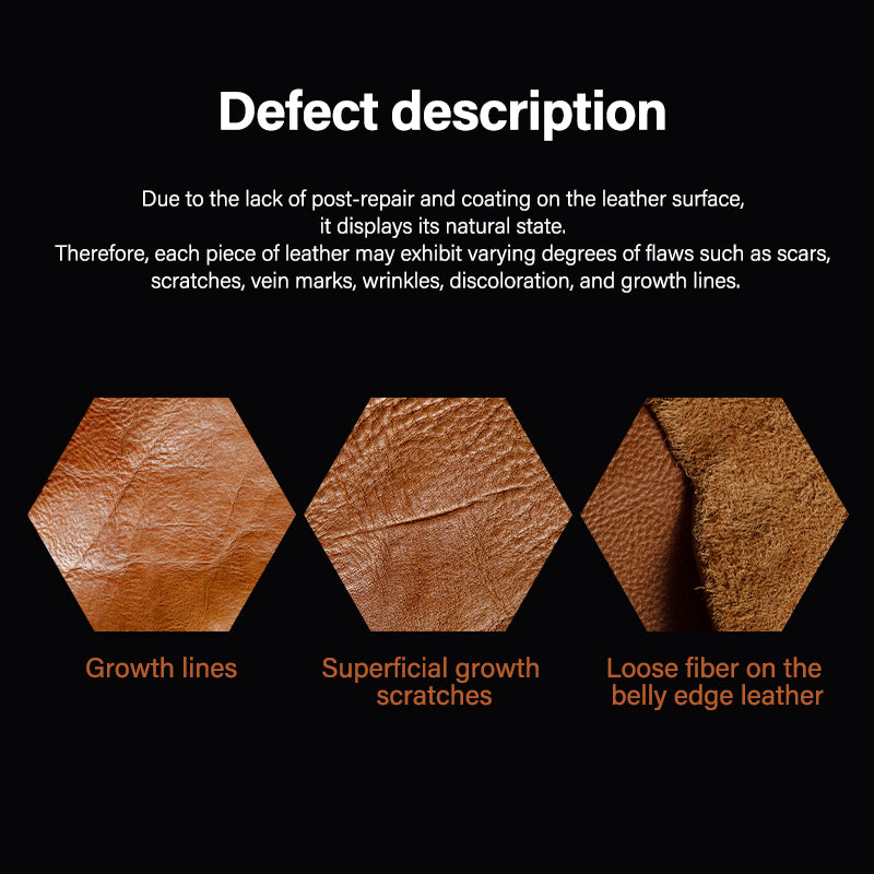 it displays its natural state. Therefore, each piece of leather may exhibit varying degrees of flaws such as scars, scratches, vein marks, wrinkles, discoloration, and growth lines.