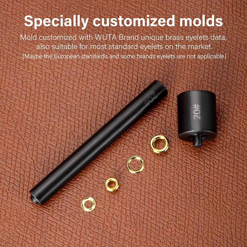 4-Specially customized molds. Mold customized with WUTA Brand unique brass eyelets data, also suitable for most standard eyelets on the market. (Maybe the European standards and some brands' eyelets are not applicable.)